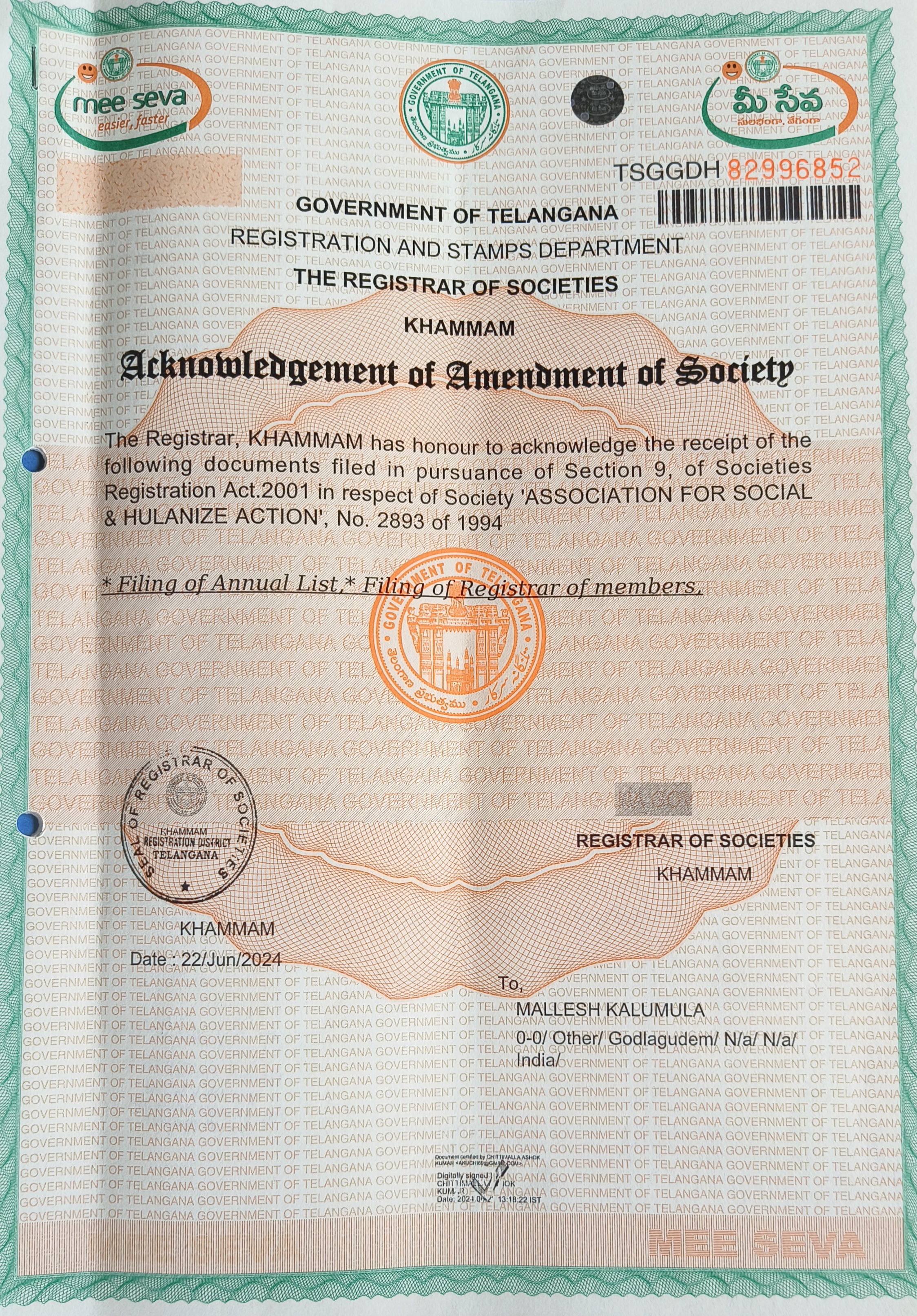 - We have negotiated/ fought with A.P.F.D for grant of Rs. 5.00Lakhs to Sirasanapalli VSS under APCFM Scheme the sale amount of Bamboo i.e.100% share, this is the first share amount received by VSS in theKhammam District.